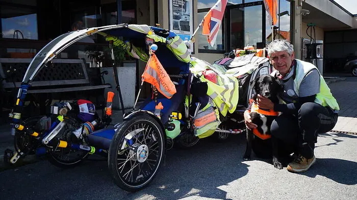 Martin Hutchinson mit Hund „Starsky“ und seinem Sitzfahrrad