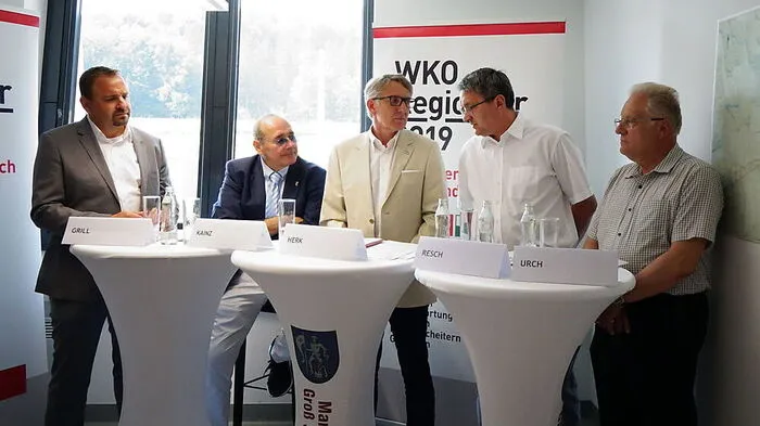 Unternehmer Gerold Grill, WKO-Regionalstellenobmann Manfred Kainz, WKO-Präsident Josef Herk, Bürgermeister Alois Resch, Unternehmer Erich Urch