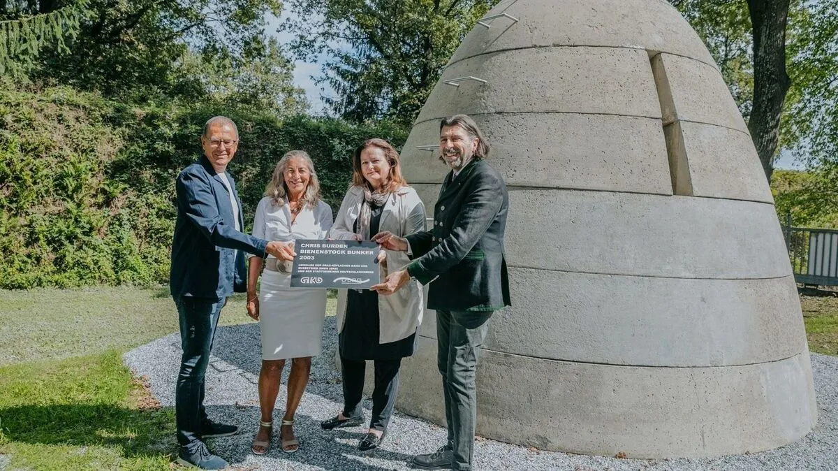 Wolfgang Muchitsch (Universalmuseum Joanneum), Skulpturenpark-Leiterin Elisabeth Fiedler, Claudia Holzer (GKB) und Bürgermeister Josef Wallner vor dem Bienenstock Bunker