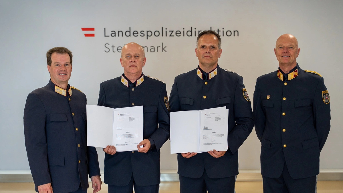 Landespolizeidirektor Gerald Ortner, Kontrollinspektoren Martin Muik und Andreas Blaskovits, Oberstleutnant Harald Eppich (Bezirkspolizeikommandant Weiz)