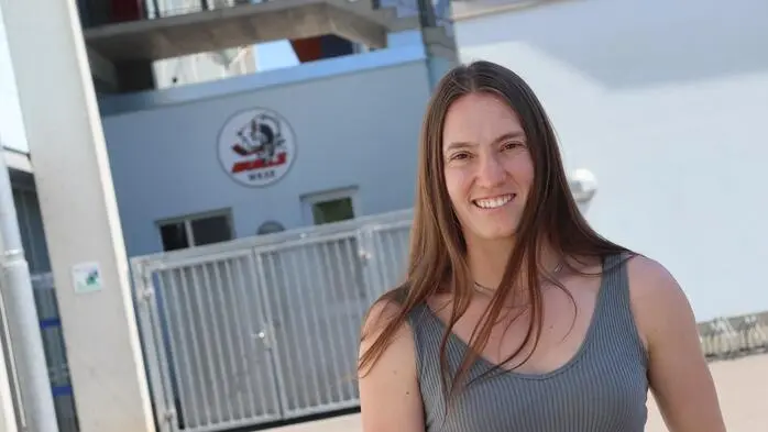Theresa Schafzahl vor der Eishalle in Weiz, wo die heutige Profi-Sportlerin mit dem Eishockey spielen begann