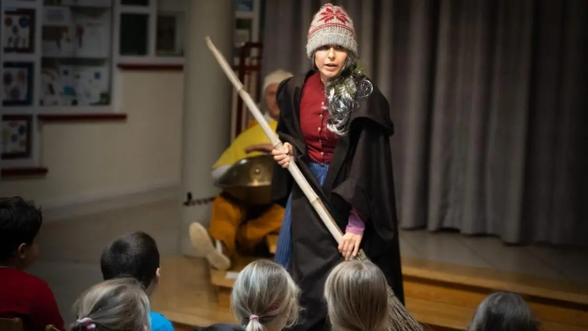 Gebückt, mit tief ins Gesicht gezogener Mütze und Besen tritt die Pudelmutter auf