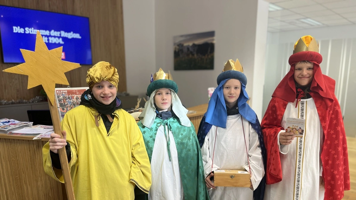 Hoher Besuch in der Redaktion der Kleinen Zeitung in Weiz: Freitagvormittag schauten die Heiligen drei Könige Kaspar, Melchior und Balthasar samt Sternträger vorbei. Mit dabei hatten sie eine frohe Botschaft, sie verkündeten nach einem religiösen Brauch die Geburt von Jesus Christus, brachten einen Segen - und sammelten Spenden für Entwicklungsprojekte der Dreikönigsaktion (etwa in Bangladesh, Tansania und den Philippinen). Begleitet wurden sie von Erika Nistelberger. Landesweit sind in diesen Tagen Sternsingerinnen und Sternsinger unterwegs.