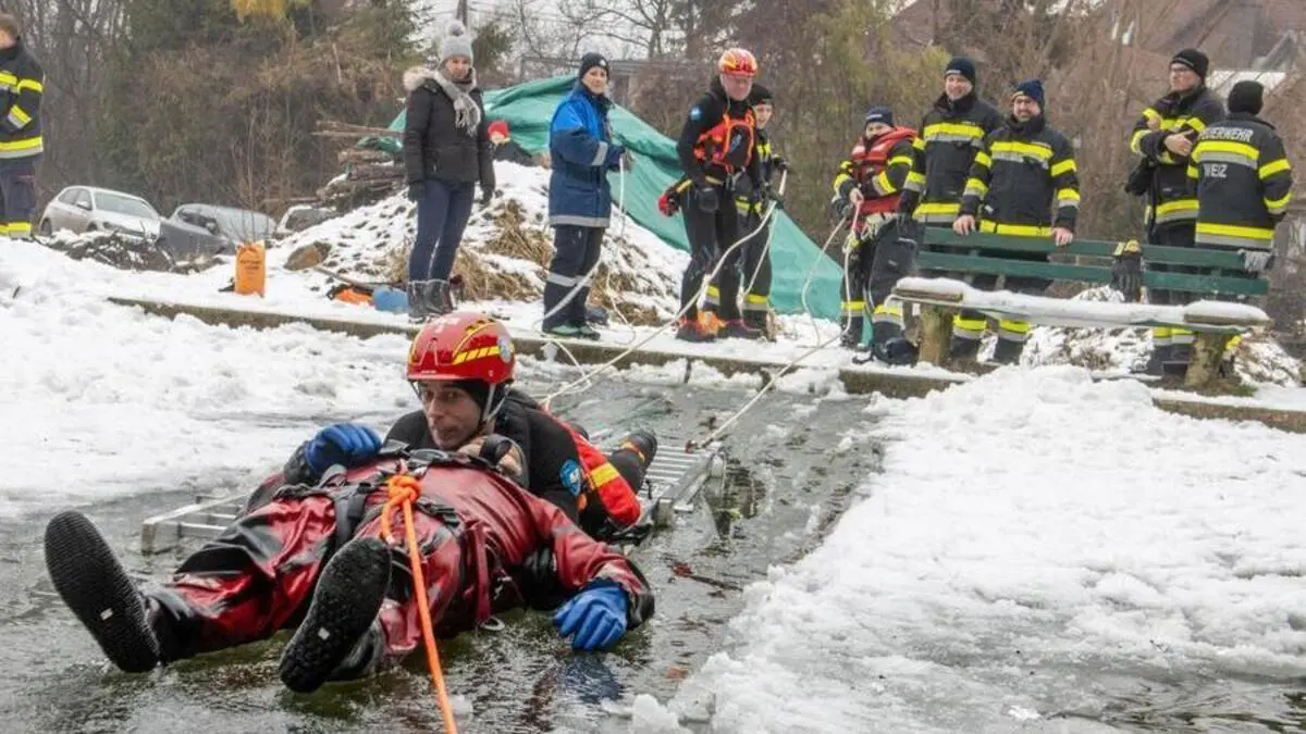 Was tun, wenn jemand im Eis eingebrochen ist? Wie man Leute aus dem eiskalten Wasser rettet, übten nun Feuerwehrleute und Wasserretter am Eisteich in Preding bei Weiz. Da zählt jede Sekunde.