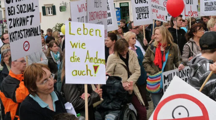 Protest Behinderter und Angehöriger gegen Sparplan. Schon vor einer Woche hatten in Weiz rund 800 Menschen an dem Solidarmarsch teilgenommen, um gegen die Sparmaßnahmen in diesem Bereich zu protestieren.