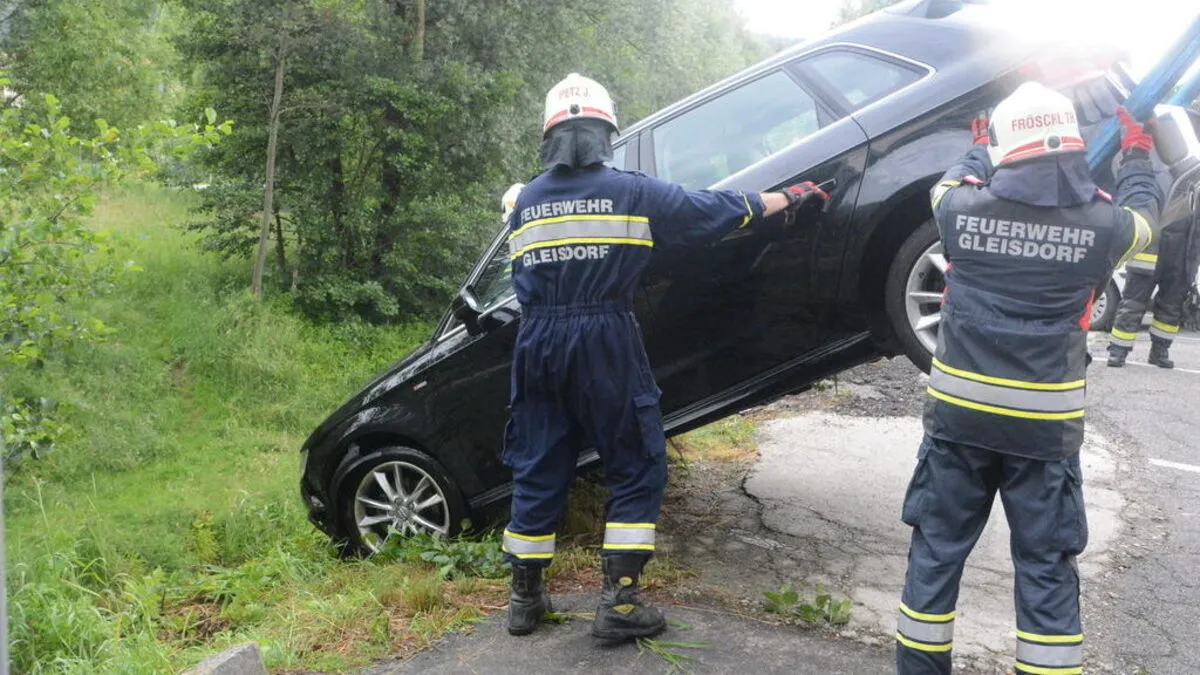 Auf einem steilen Straßenstück in Markt Hartmannsdorf geriet ein Auto ins Rutschen - bis in den Bach.