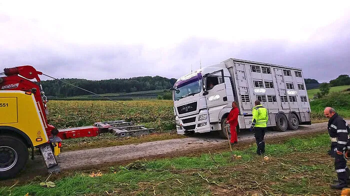 Schweinetransporter bleib in Neudorf (Gemeinde Ilztal) in weichem Bankett neben schmaler Gemeindestraße stecken.