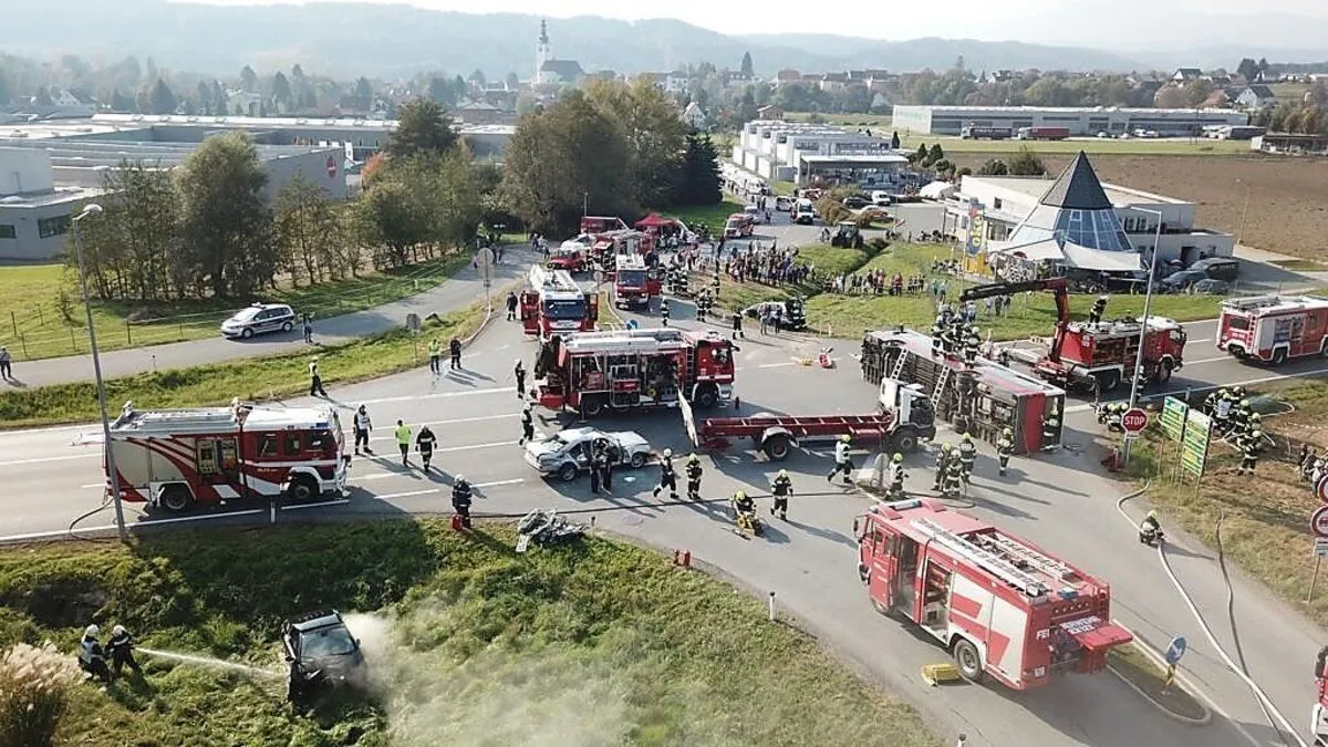 Etliche Feuerwehren probten ihren Arbeitseinsatz und die Organisation während eines Unfalles mit Bus und mehreren Pkw. Auch in Pischelsdorf wurde eine heikle Situation geübt: Absturz eines Ballons.