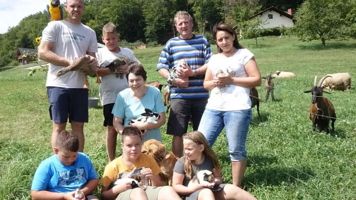 Vater Andreas Zöhrer mit Ara Maxi und Laufente, Alexander mit Katze Schnurli, Oma Luise mit Hase Stupsi, Opa Franz mit Papas Lieblingshenne, Mama Barbara mit einer Wachtelhenne (hinten) sowie  Florian mit Hamster Amy, Cousin Philipp und Anna mit den Meerschweinchen Luis und Franz und Hund Lilly