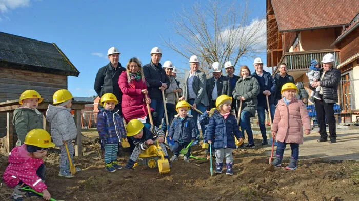 Die künftigen Nutzerinnen und Nutzer der Kinderkrippe halfen beim Spatenstich in Flöcking mit