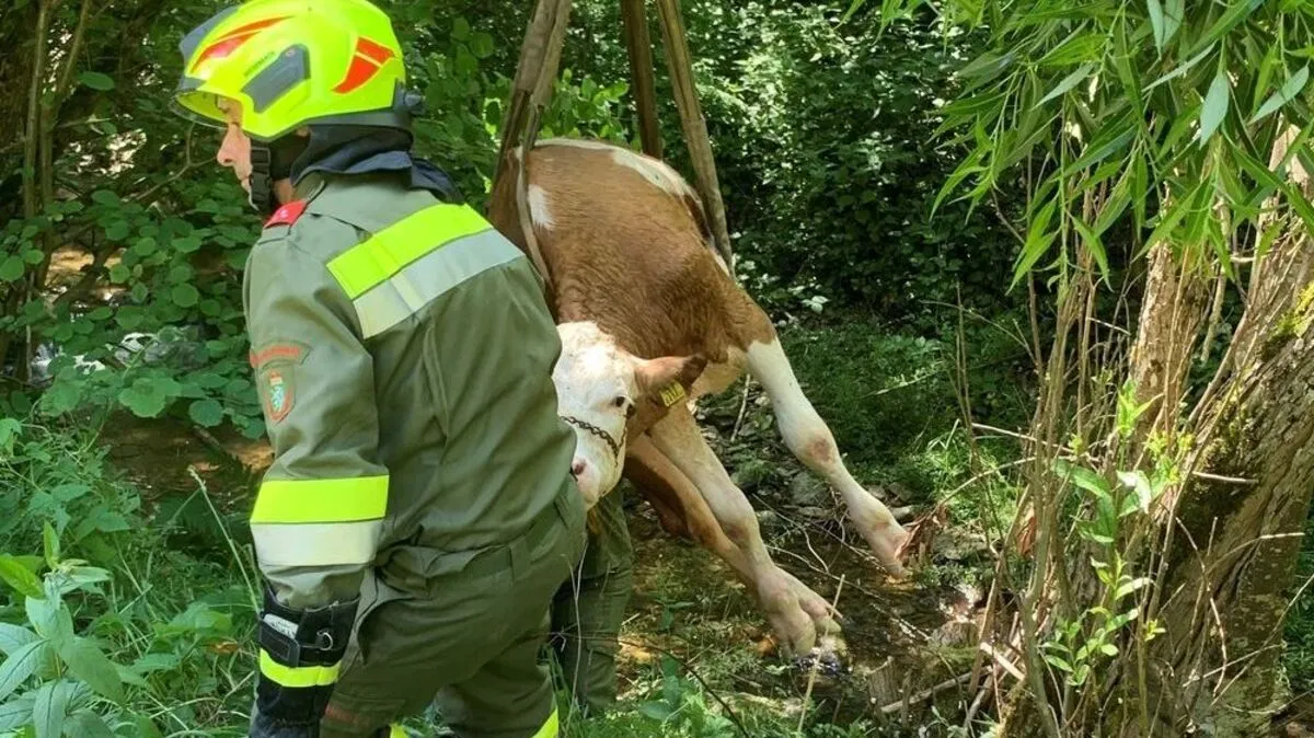 Ein Wanderer entdeckte das ausgebüxte Kalb, das die Nacht im kalten Miesenbach verbracht hatte. Die Feuerwehr rückte mit dem Kran aus.