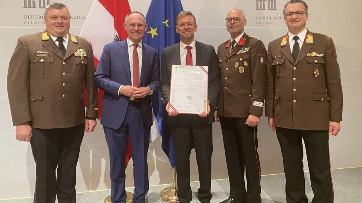 Bereichsfeuerwehrkommandant Johann Maier-Paar, Innenminister Gerhard Karner, Manfred Gussmagg (Rosendahl Nextrom), BI Josef Monschein (FF Pischelsdorf) und Landesfeuerwehrkommandant-Stellvertreter Erwin Grangl