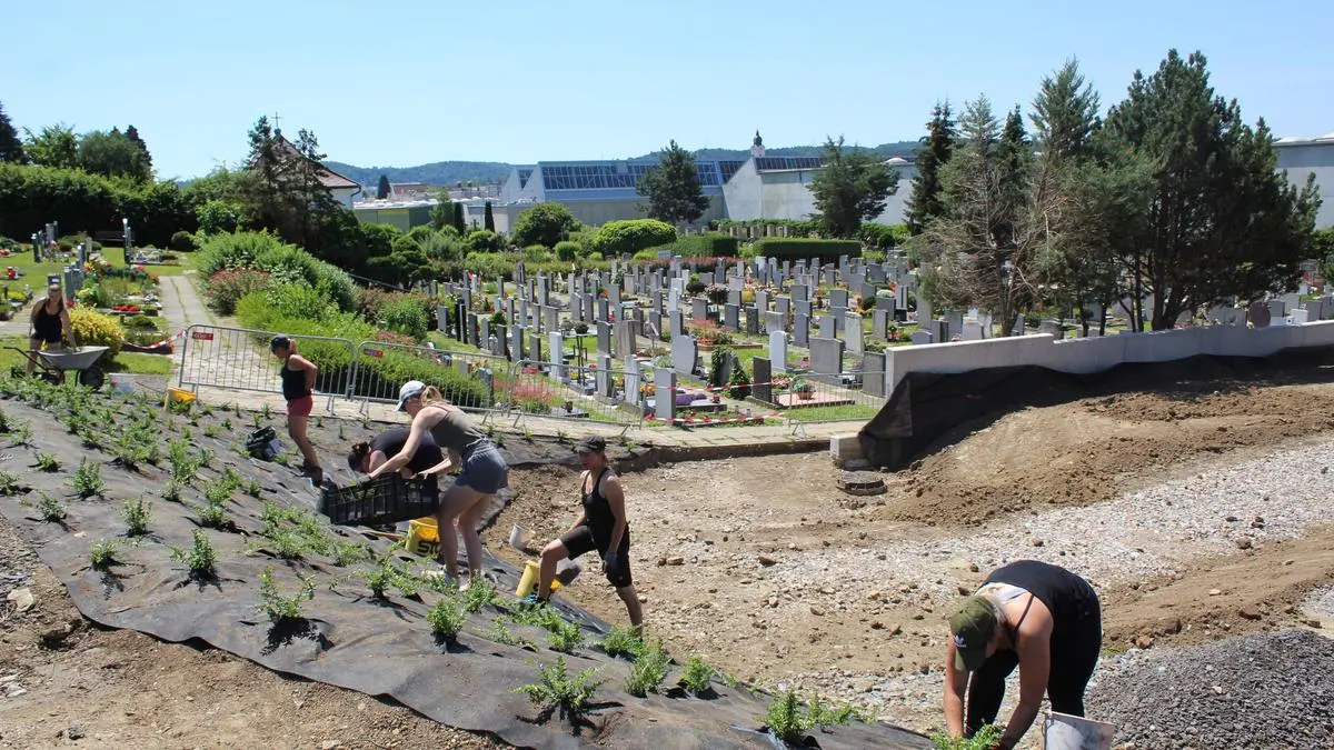 Die Arbeiten für das neue Baumbestattungs-Areal am Gleisdorfer Friedhof schreiten voran. Vor wenigen Wochen startete das Team, rund um Meistergärtnerin Anna Angermann, mit der Bepflanzung. 15 von 28 Bäumen wurden bereits gesetzt. "Es handelt sich dabei um heimische Laubbäume. Auch Ziergräser und Sträucher sollen die Streuwiese mit Bestattungsbäumen verschönern", sagt Angermann. Die nächste Pflanzaktion findet in der Woche vom 11. bis 16. Juli statt. Gemäß dem Motto "Viele Hände, schnelles Ende", werden noch freiwillige Helferinnen und Helfer gesucht.