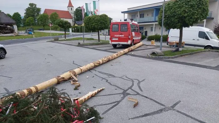 Der Maibaum der FF Söding wurde in der ersten Nacht nach dem Aufstellen von Unbekannten umgesägt. Nun ist die Stimmung getrübt, da viel Arbeitszeit in die Schnitzereien investiert wurde.