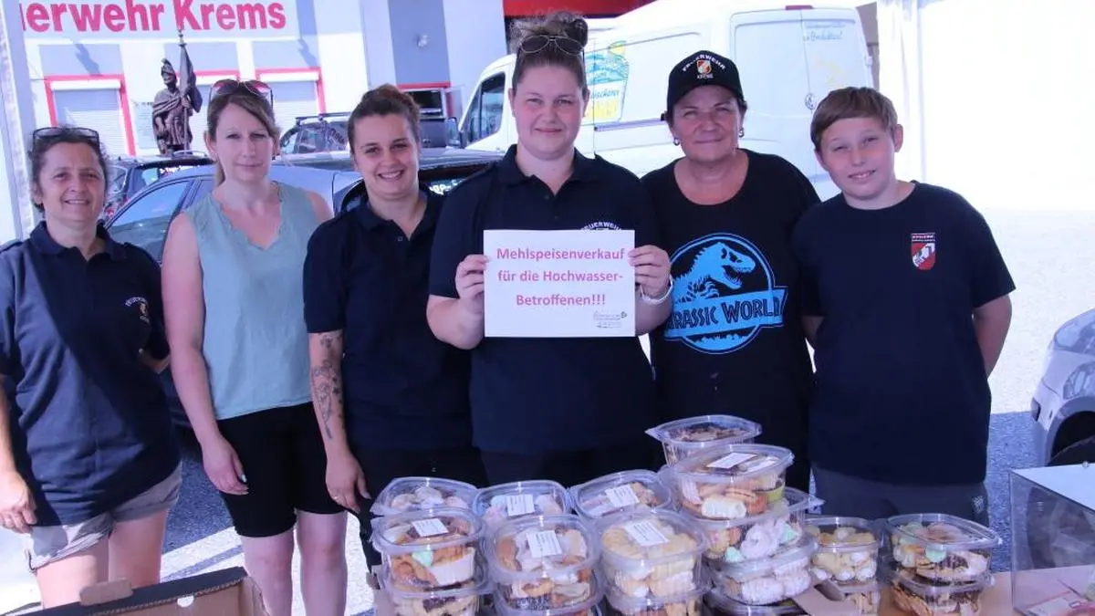 Mitglieder der FF Krems verkauften Mehlspeisen für Hochwasserbetroffene