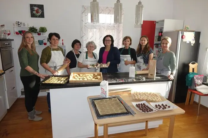 Gemeinsam mit Bezirksbäuerin Anita Suppanschitz backen sechs Mitglieder vom Beirat der Bäuerinnenorganisation Bezirk Voitsberg mit: Resi Schriebl, Gudrun Pressler, Petra Fraißler, Susanne Atzler, Christine Schutti, Helga Spari und Karin Rößl. Für das gemeinschaftliche Backen hat Schriebl ihre Stube in Maria Lankowitz geöffnet: „Es ist alles da, alles was ihr seht, kann verwendet werden“, sagt sie zum Start um 8 Uhr in der Früh. Zu diesem Zeitpunkt sind bereits einige Plastikkisten mit Vanillekipferln, Linzeraugen und anderen Klassikern gefüllt. Die hat Schriebl bereits vorbereitet, je mehr Kekse für den guten Zweck zusammen kommen, umso besser. Die Lankowitzerin liebt es zu backen, „aber zu Weihnachten brauche ich dann keine Kekse mehr“, erzählt sie lachend.