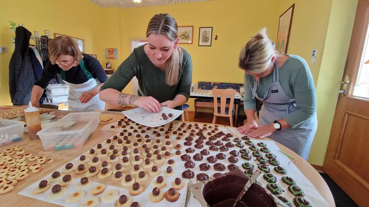 Mehl und Zucker stehen auf dem Tisch, ein Kübel mit Marillenmarmelade für die Husarenkrapferl, und natürlich ganz viele Kekse in verschiedenen Fertigungsstadien. Gudrun Pressler legt gerade bei Steirerhüten Hand an: Dabei handelt es sich um Gebäck, das aus einem Mürbteigboden mit Punschfüllung besteht, überzogen mit einer Schicht edler Schokolade. Damit die Kekse tatsächlich wie die namensgebende Kopfbedeckung aussehen, wird noch eine Kordel aus grünem Marzipan auf die süße Krempe drapiert. Und das alles für den guten Zweck: Der Erlös aus dem Verkauf der Kekse kommt „Steirer helfen Steirern“, der Hilfsaktion der Kleinen Zeitung, zugute.