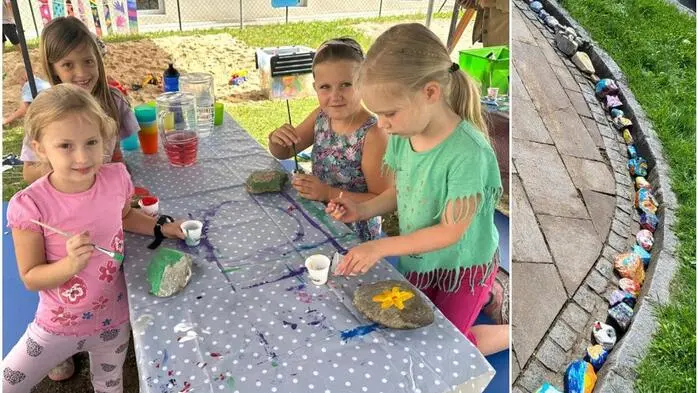 Die Kinder bemalten Steine, die nun den Ortsplatz in Rosental verschönern