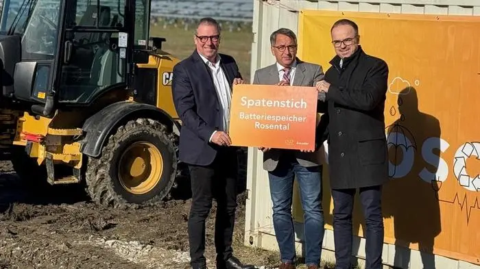 v.l.: Bernd Lippacher (PLB Energie GmbH), Bürgermeister Johannes Schmid und Hanspeter Nussbacher (GKB Bergbau) setzten den Spatenstich