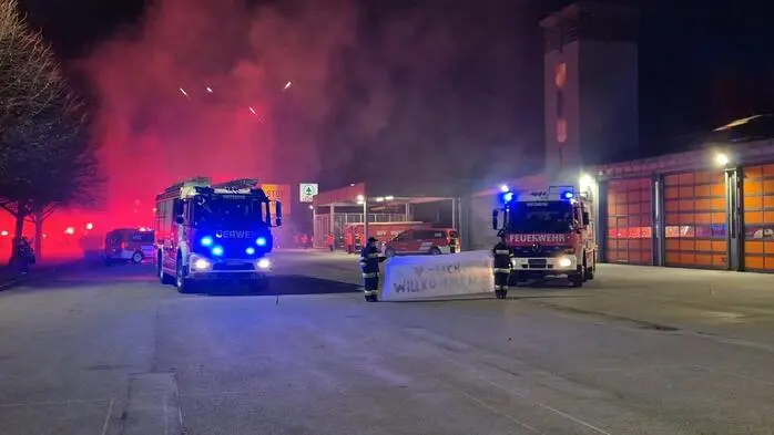 Fontänen und Sirenen: Feuerwehrmitglieder feiern Ankunft ihres neuen Fahrzeugs