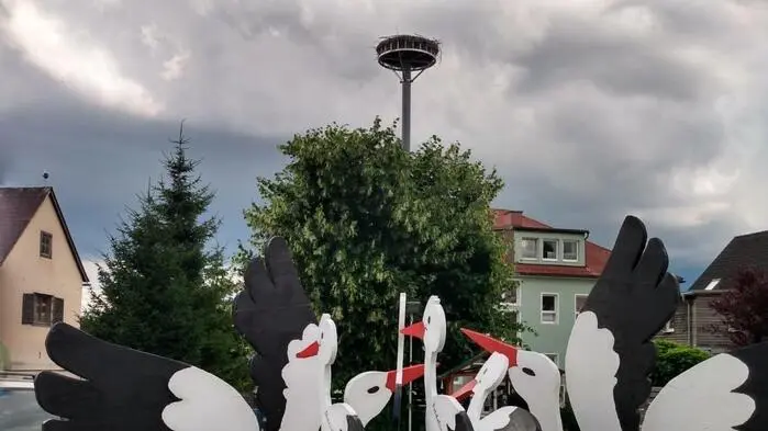 Familie Plos betreut das Nest und stellt bei der Ankunft der Störche – oder des Nachwuchses – ihre Holzebenbilder auf