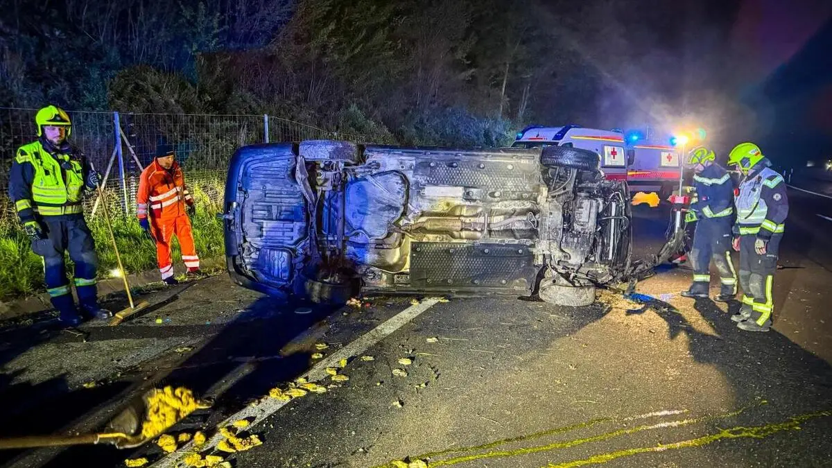 In den frühen Morgenstunden überschlug sich am Montag ein Pkw auf der A2 Südautobahn auf der Höhe St. Stefan ob Stainz. Zwei Insassen wurden verletzt, einer davon schwer.