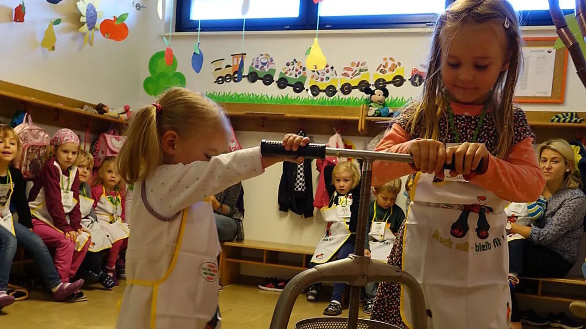 Die „Fit und g’sund statt kugelrund“-Tour machte gestern im Kindergarten Pichling Station. Die Kleinen waren begeistert und legten an der Apfelpresse gleich selbst Hand an.
