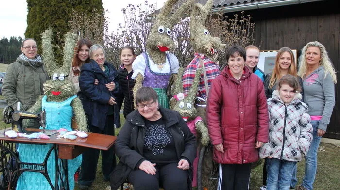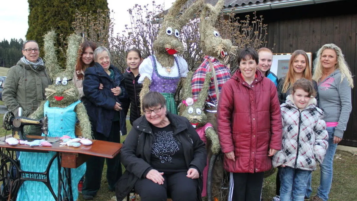 Monika Leicht (ganz rechts) bastelt mit Hausbewohnern der Lebenshilfe und Jugendlichen aus Stallhofen Strohtiere