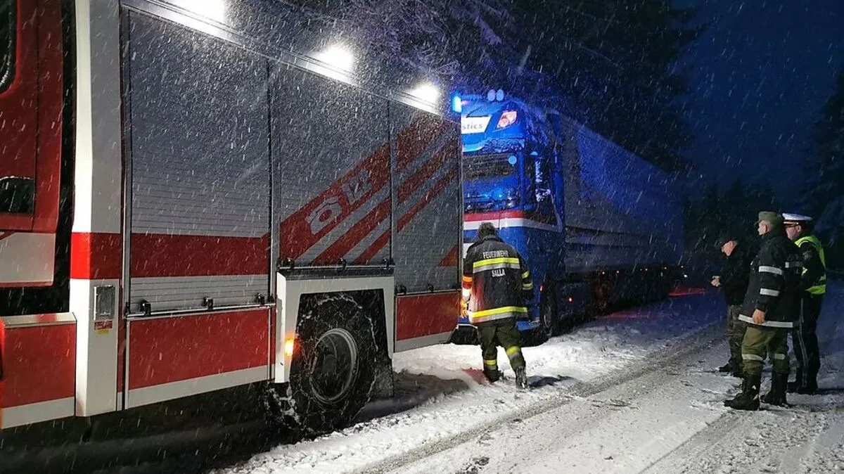 Die Feuerwehr Salla kämpft bei Schnee Winter für Winter mit hängengebliebenen Lkw