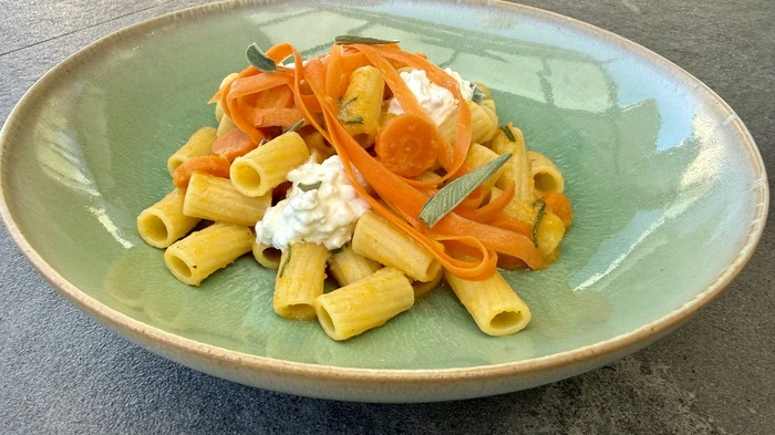 Die fertigen Nudeln mit Hüttenkäse, den marinierten Karottenstreifen und ein paar Salbeiblättern anrichten.