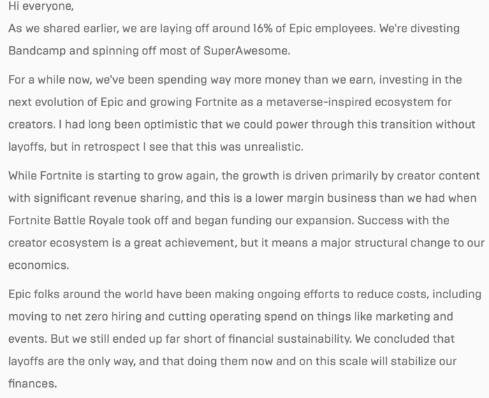 Auch zum Ende des Jahres scheint die Krise nicht abzuflachen. Weitere Entwicklerstudios haben in den letzten Tagen zahlreiche Mitarbeiterinnen und Mitarbeiter entlassen. Beim "Fortnite"-Entwickler "Epic Games" sind 16 Prozent der Belegschaft betroffen gewesen, wie auf der Firmen-Website bekannt gegeben wurde. Die aktuellen Einnahmen würden die Kosten des Unternehmens nicht mehr decken.