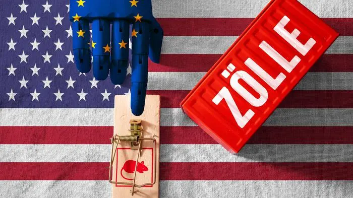 Eine Hand mit europäischer Flagge tippt auf eine Mausefalle über einer US-Flagge, daneben ein Container mit der Aufschrift |  Tappt die EU mit ihren Gegenmaßnahmen in eine Falle?