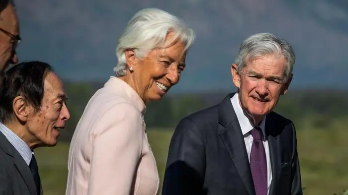 EZB-Chefin Christina Lagarde beim Notenbanker-Treffen in Jackson Hole mit Federal Reserve-Präsident Jerome Powell (rechts)