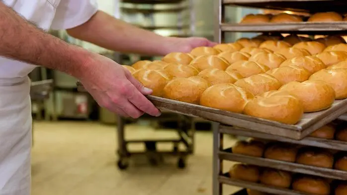 Ein Backblech mit Aufbackbrötchen wird von einem Mitarbeiter in einen Rollwagen geschoben | Größere Brötchen werden nicht gebacken, aber die Gehälter steigen leicht