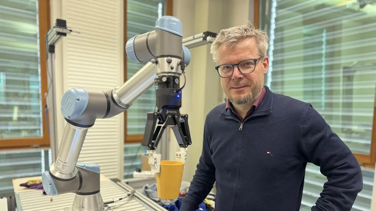 Hubert Zangl, Leiter des Instituts für Intelligente Systemtechnologien an der Uni Klagenfurt | Hubert Zangl führt vor, dass der Robotergreifer dank Sensor auch mit Trinkbechern umgehen kann