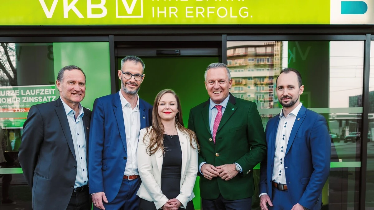 Willkommensfeier in der VKB Beratungsfiliale in der Grazer Conrad-von-Hötzendorf-Straße 94: VKB-Aufsichtsratsvorsitzender Matthäus Schobesberger, der steirische Vertriebsdirektor Wolfgang Fankhauser, Filialleiterin Graz Sarah Steiner, Landeshauptmann Mario Kunasek und VKB-Generaldirektor Markus Auer