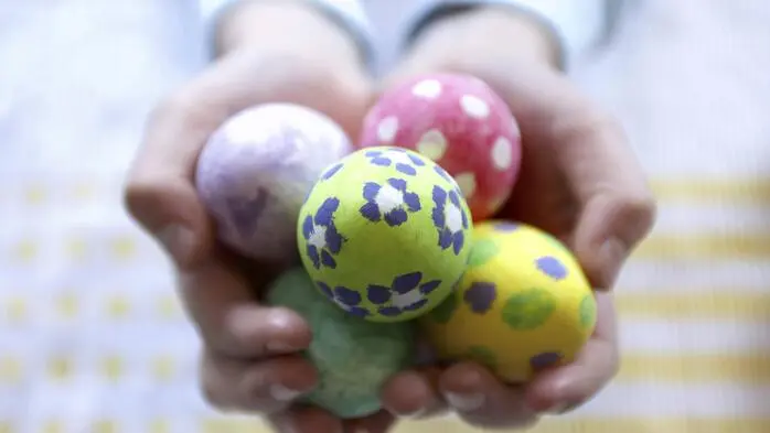 Zwei Hände halten bunte bemalte Eier | Bis inklusive Ostern heißt es im Handel: „Temporäre Engpässe gerade vor Ostern können in Ausnahmefällen nicht ausgeschlossen werden.“