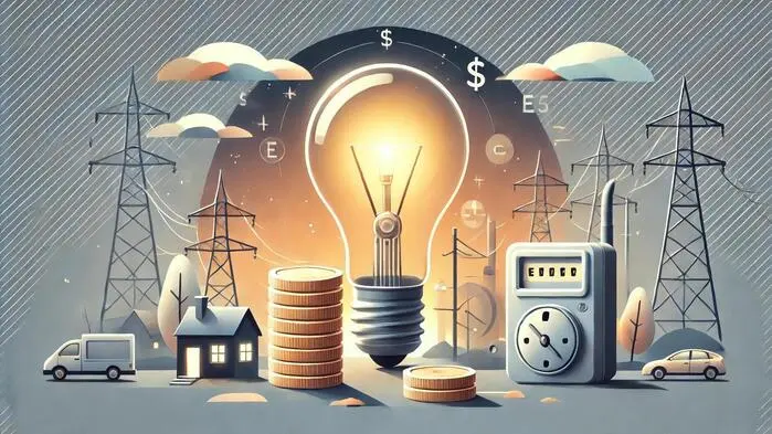 Ein Symbolfoto zeigt eine übergroße Glühbirne zwischen Strommasten und einem Stromzähler mit gestapelten Münzen | Nach dem Verbund zogen andere große Energieversorger nach und senkten ihre Strompreise