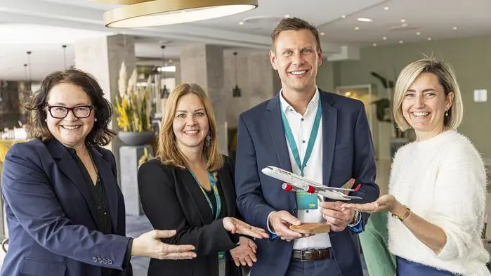Trotz Krisenstimmung optimistisch: Klagenfurter Flughafenchef Maximilian Wildt mit Sarah Nussbaumer (Kärnten Werbung, rechts)