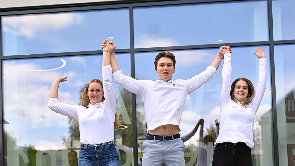 Erstplatzierte Hannah Satz (Kelag), Matthias Himmelbauer (Springer) und Christina Sereinig (Infineon) im Hof des GPS-Ausbildungszentrums in Villach: „Wir lernen – und umgekehrt kann man von uns lernen“