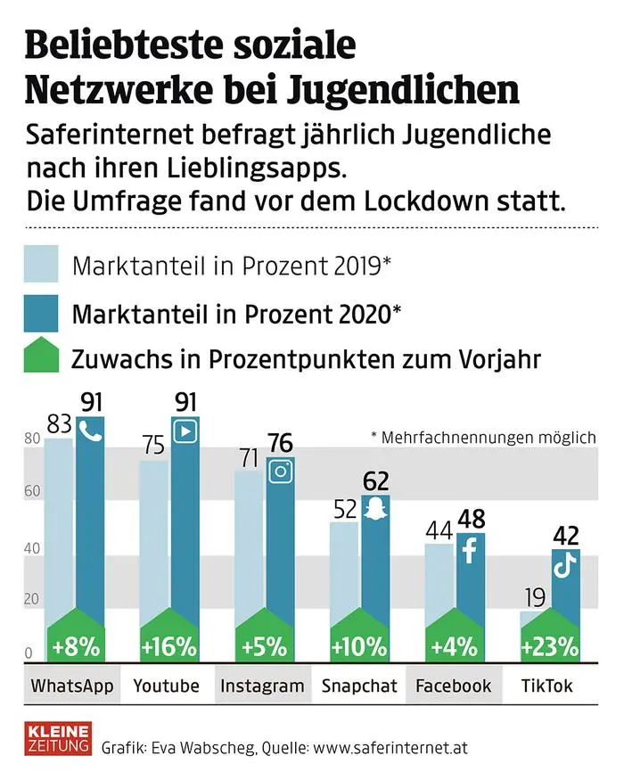 Wie der „Jugend-Internet-Monitor 2020“ zeigt, ist TikTok auch in Österreich die am schnellsten wachsende Plattform (siehe Grafik). In der Altersgruppe der Elf- bis 17-Jährigen nutzen 42 Prozent TikTok, bei den Mädchen sind es sogar 46 Prozent, bei den Burschen 38 Prozent.Bei den ganz Jungen kommt TikTok vor allem deswegen so gut an, weil viele Influencer mittlerweile von Instagram und YouTube auf TikTok wechseln, meint Matthias Jax vom österreichischen Institut für angewandte Telekommunikation. „Die App ist schnell, bunt und simpel aufgebaut, dadurch trifft sie genau den Zeitgeist.“ Dabei speichert sie zwar allerhand Nutzerdaten, aber das meiste davon haben andere auf dem Smartphone installierte Apps sowieso schon gespeichert. Was mit den Daten passiert weiß niemand.