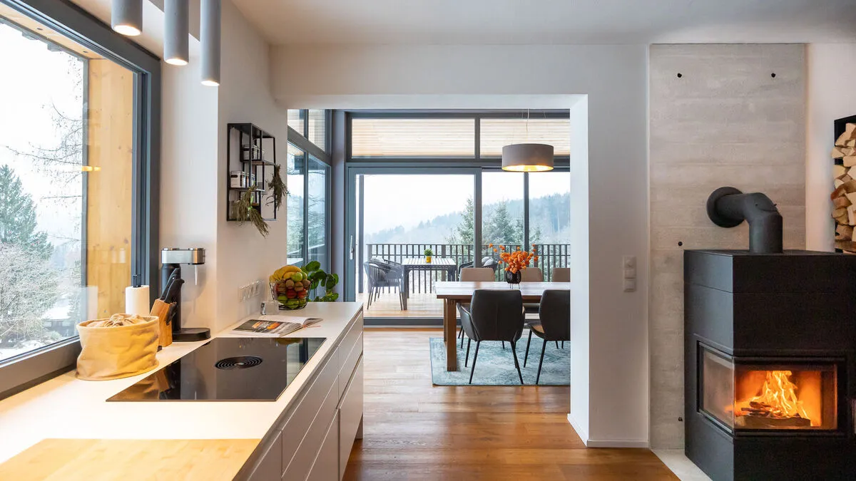 Blick von der Küche in den offenen Wohn- und Essbereich
