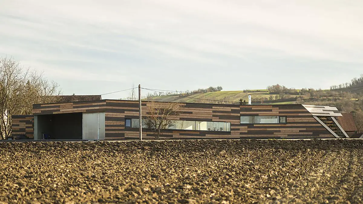 Mit seiner Fassade aus zweifärbigen, horizontal gelegten Lärchenholzbrettern bekam das Haus am Acker den perfekten Tarnanzug.